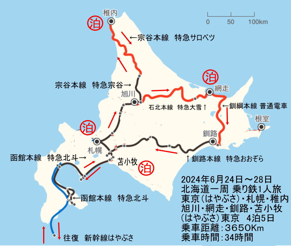 東京(はやぶさ)・札幌・稚内・旭川・網走・釧路・苫小牧・(はやぶさ)東京